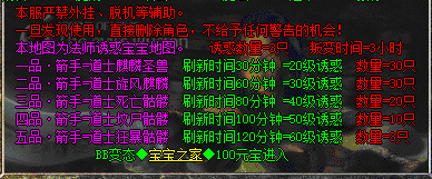 策略:活动刷新五波,物品成倍叠加,是玩家必抢的活动。进入地图后,所有玩家简装显示,隐藏姓名、称号,强制全体模式,杀人不增加PK值,死亡会掉天下无敌状态。