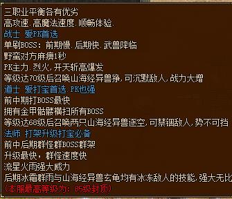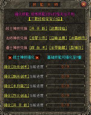 战士:开天斩、武兽降临;道士:金甲骷髅、噬血术;法师:流星火雨、召唤法兽。