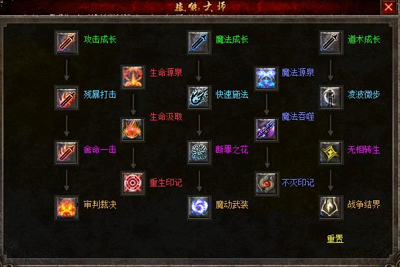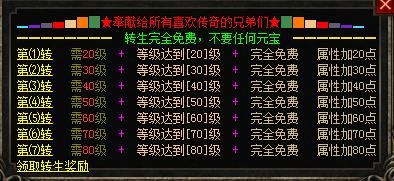20级后每升10级都可以通过NPC转生获得属性点和天赋点,属性点可自选属性添加,天赋点可在NPC激活天赋属性或技能。3-5-7转还可领取转生装备奖励,非常实用。