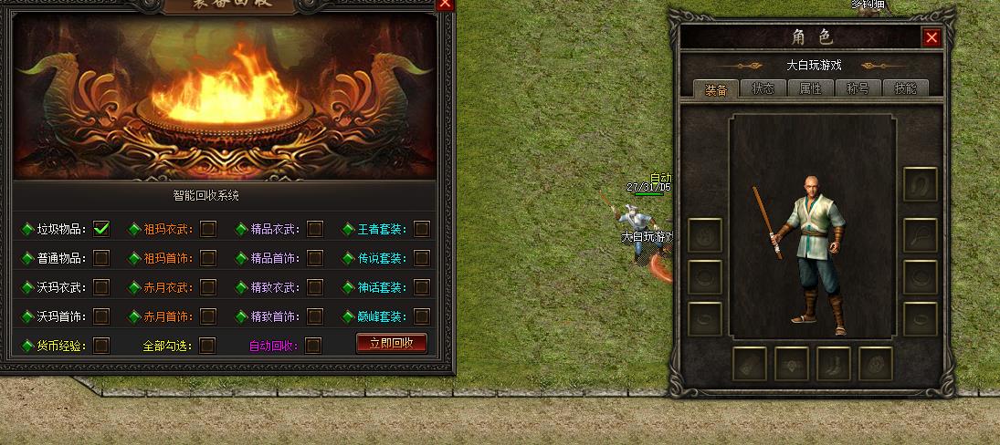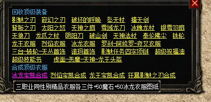 精致及以下装备可自动回收获得金币,部分实物材料可回收元宝,高级装备回收在NPC处可获得元宝、经验和声望。金币除了买药可在交易市场买卖装备、升级项链幸运、元素洗练、兑换战马坐骑、加天赋属性技能、参加活动等。元宝可用来技能强化、购买称号、传送神秘地图BOSS房间、开启怪物攻城、参加活动等。
