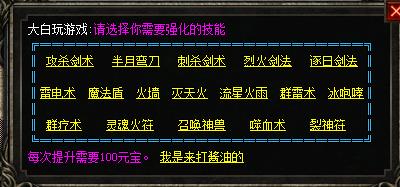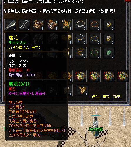 新技能:N多新技能(战士:莲月剑法、破血狂杀、铁布衫、龙影剑法、逐日剑法、擒龙手、狮子吼等等,法师:焰天火雨、龙卷风、旋风墙、凝血离魂、群体雷电术、五雷轰、流星火雨、冰霜群雨等等,道士:月魂凌波、妙影无踪、裂神符、噬血术、阴阳法环等等)。