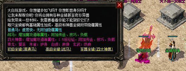 新坐骑:传奇3的各种战马、老虎坐骑和四大神兽超级坐骑,配套骑马衣服和动作。