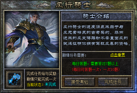 风行骑士每日答题。一共10题需答对7题,获得称号属性!