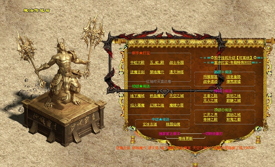 1、整体游戏以复古为主,为后期不无聊,增加各类套装属性,增加轩辕神装(终极)。且增加了回收系统,轩辕终极可无限升级属性。